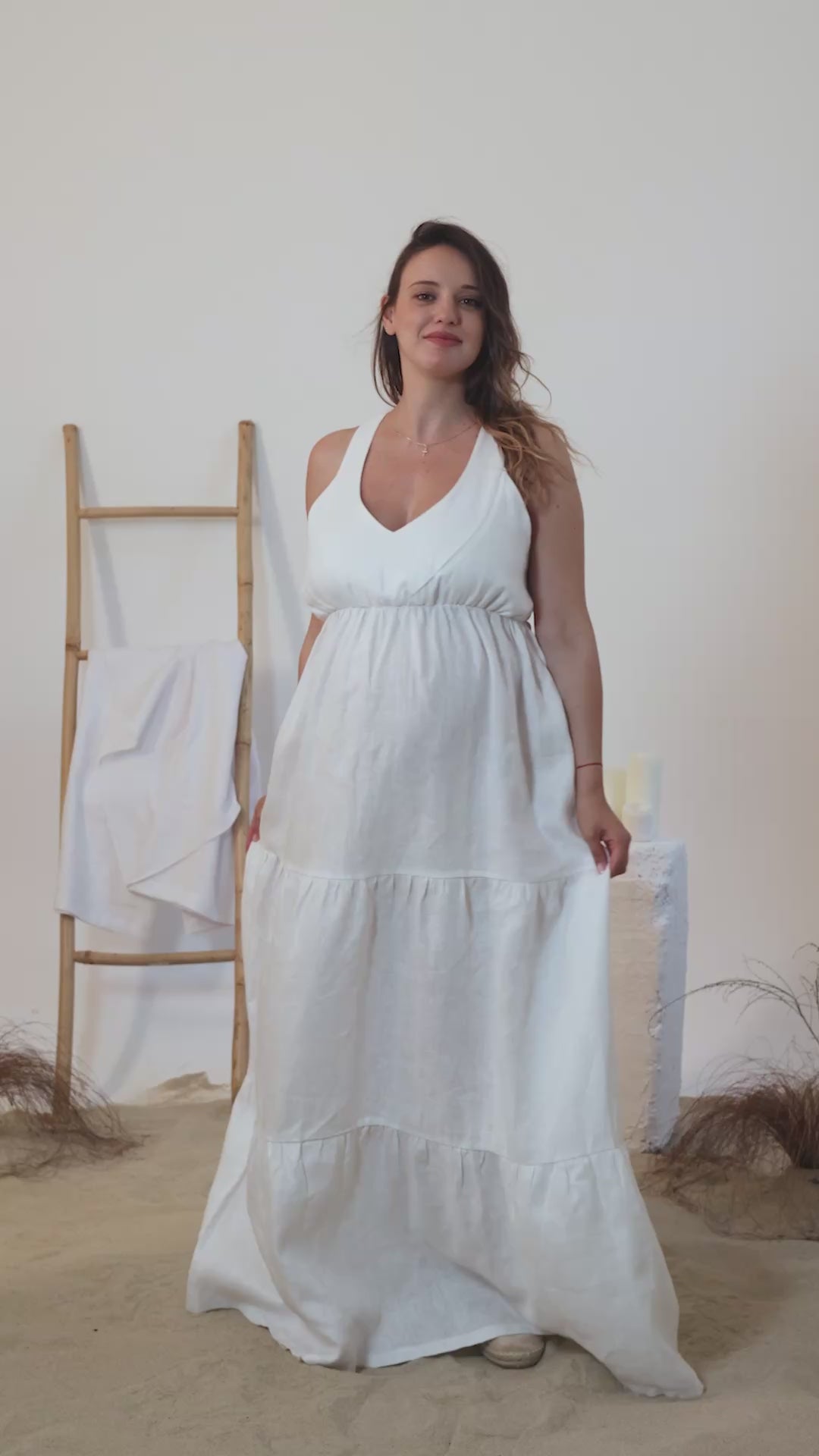 Бяла ленена макси рокля за бременни без ръкави